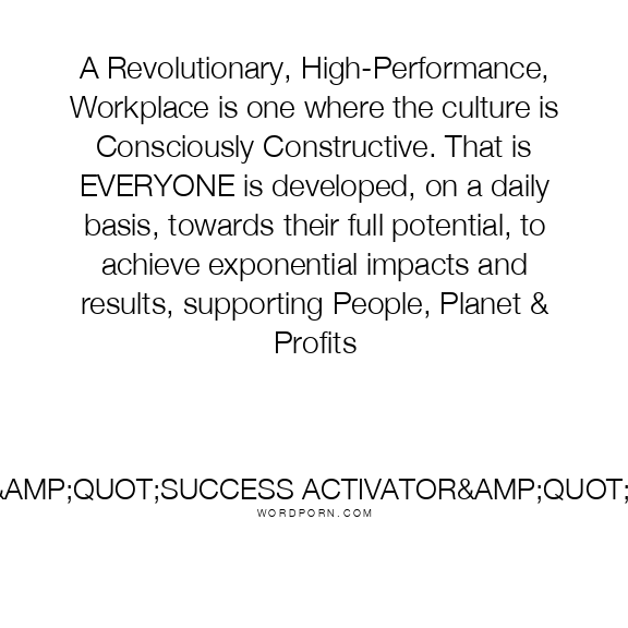 A Revolutionary, High-Performance, Workplace is one where the culture is Consciously Constructive. That is EVERYONE is developed, on a daily basis, towards their full potential, to achieve exponential impacts and results, supporting People, Planet & Profits