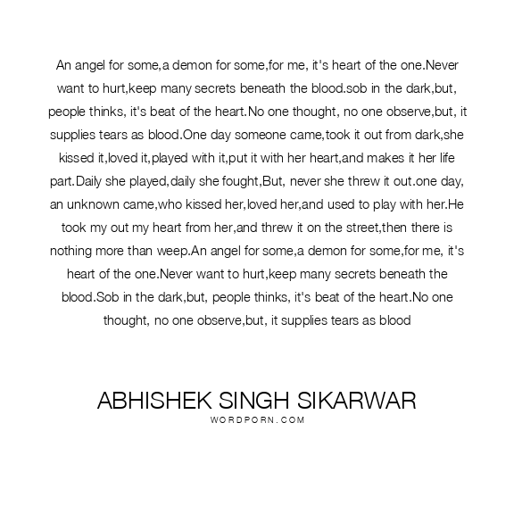 An angel for some,a demon for some,for me, it’s heart of the one.Never want to hurt,keep many secrets beneath the blood.sob in the dark,but, people thinks, it’s beat of the heart.No one thought, no one observe,but, it supplies tears as blood.One day someone came,took it out from dark,she kissed it,loved it,played with it,put it with her heart,and makes it her life part.Daily she played,daily she fought,But, never she threw it out.one day, an unknown came,who kissed her,loved her,and used to play with her.He took my out my heart from her,and threw it on the street,then there is nothing more than weep.An angel for some,a demon for some,for me, it’s heart of the one.Never want to hurt,keep many secrets beneath the blood.Sob in the dark,but, people thinks, it’s beat of the heart.No one thought, no one observe,but, it supplies tears as blood