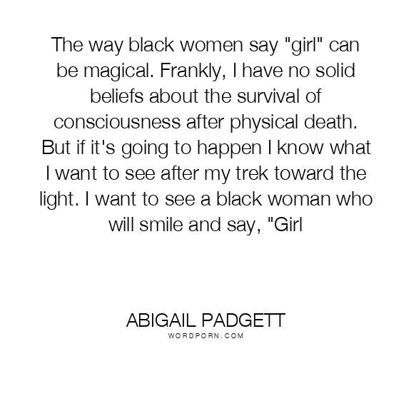 The way black women say "girl" can be magical. Frankly, I have no solid beliefs about the survival of consciousness after physical death. But if it's going to happen I know what I want to see after my trek toward the light. I want to see a black woman who will smile and say, "Girl