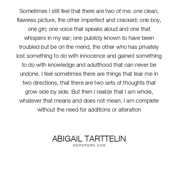 Sometimes I still feel that there are two of me: one clean, flawless picture, the other imperfect and cracked; one boy, one girl; one voice that speaks aloud and one that whispers in my ear; one publicly known to have been troubled but be on the mend, the other who has privately lost something to do with innocence and gained something to do with knowledge and adulthood that can never be undone. I feel sometimes there are things that tear me in two directions, that there are two sets of thoughts that grow side by side. But then I realize that I am whole, whatever that means and does not mean; I am complete without the need for additions or alteration