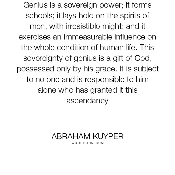 Genius is a sovereign power; it forms schools; it lays hold on the spirits of men, with irresistible might; and it exercises an immeasurable influence on the whole condition of human life. This sovereignty of genius is a gift of God, possessed only by his grace. It is subject to no one and is responsible to him alone who has granted it this ascendancy