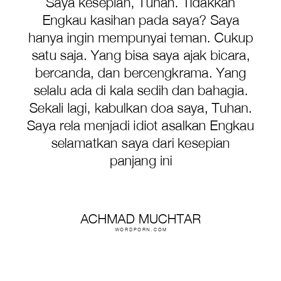 Saya kesepian, Tuhan. Tidakkah Engkau kasihan pada saya? Saya hanya ingin mempunyai teman. Cukup satu saja. Yang bisa saya ajak bicara, bercanda, dan bercengkrama. Yang selalu ada di kala sedih dan bahagia. Sekali lagi, kabulkan doa saya, Tuhan. Saya rela menjadi idiot asalkan Engkau selamatkan saya dari kesepian panjang ini