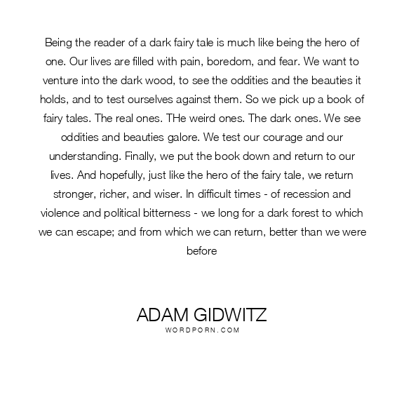 Being the reader of a dark fairy tale is much like being the hero of one. Our lives are filled with pain, boredom, and fear. We want to venture into the dark wood, to see the oddities and the beauties it holds, and to test ourselves against them. So we pick up a book of fairy tales. The real ones. THe weird ones. The dark ones. We see oddities and beauties galore. We test our courage and our understanding. Finally, we put the book down and return to our lives. And hopefully, just like the hero of the fairy tale, we return stronger, richer, and wiser. In difficult times - of recession and violence and political bitterness - we long for a dark forest to which we can escape; and from which we can return, better than we were before