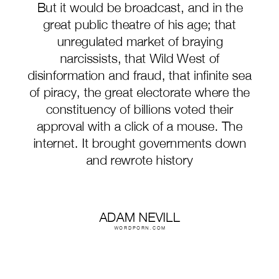 But it would be broadcast, and in the great public theatre of his age; that unregulated market of braying narcissists, that Wild West of disinformation and fraud, that infinite sea of piracy, the great electorate where the constituency of billions voted their approval with a click of a mouse. The internet. It brought governments down and rewrote history
