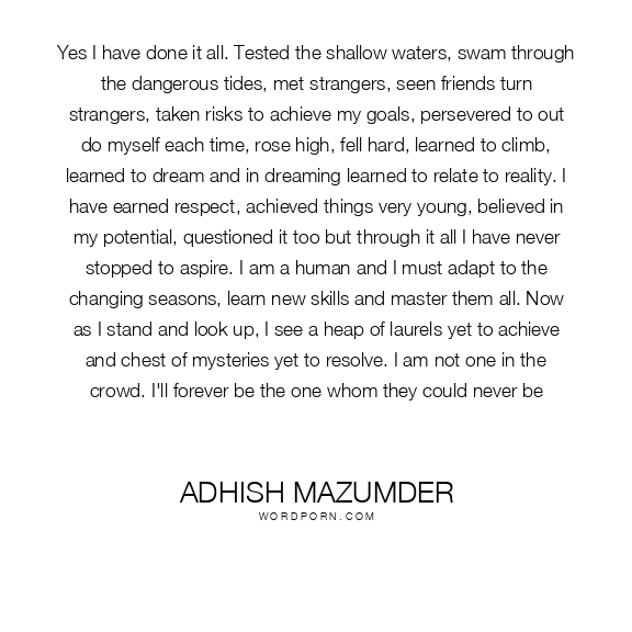 Yes I have done it all. Tested the shallow waters, swam through the dangerous tides, met strangers, seen friends turn strangers, taken risks to achieve my goals, persevered to out do myself each time, rose high, fell hard, learned to climb, learned to dream and in dreaming learned to relate to reality. I have earned respect, achieved things very young, believed in my potential, questioned it too but through it all I have never stopped to aspire. I am a human and I must adapt to the changing seasons, learn new skills and master them all. Now as I stand and look up, I see a heap of laurels yet to achieve and chest of mysteries yet to resolve. I am not one in the crowd. I'll forever be the one whom they could never be