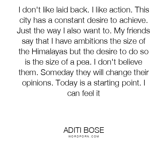 I don't like laid back. I like action. This city has a constant desire to achieve. Just the way I also want to. My friends say that I have ambitions the size of the Himalayas but the desire to do so is the size of a pea. I don't believe them. Someday they will change their opinions. Today is a starting point. I can feel it