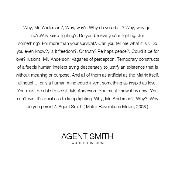 Why, Mr. Anderson?, Why, why?. Why do you do it? Why, why get up?.Why keep fighting?. Do you believe you're fighting...for something?.For more than your survival?. Can you tell me what it is?. Do you even know?; Is it freedom?, Or truth?.Perhaps peace?. Could it be for love?Illusions, Mr. Anderson. Vagaries of perception. Temporary constructs of a feeble human intellect trying desperately to justify an existence that is without meaning or purpose. And all of them as artificial as the Matrix itself, although... only a human mind could invent something as insipid as love. You must be able to see it, Mr. Anderson. You must know it by now, You can't win. It's pointless to keep fighting. Why, Mr. Anderson?. Why?, Why do you persist?. Agent Smith ( Matrix Revolutions Movie, 2003 )
