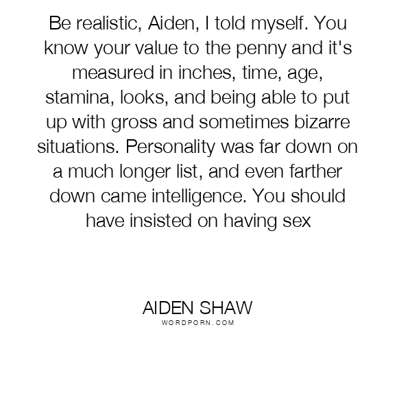 Be realistic, Aiden, I told myself. You know your value to the penny and it's measured in inches, time, age, stamina, looks, and being able to put up with gross and sometimes bizarre situations. Personality was far down on a much longer list, and even farther down came intelligence. You should have insisted on having sex