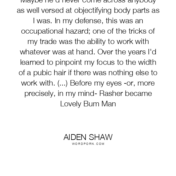 Maybe he'd never come across anybody as well versed at objectifying body parts as I was. In my defense, this was an occupational hazard; one of the tricks of my trade was the ability to work with whatever was at hand. Over the years I'd learned to pinpoint my focus to the width of a pubic hair if there was nothing else to work with. (...) Before my eyes -or, more precisely, in my mind- Rasher became Lovely Bum Man