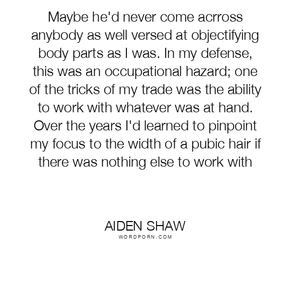 Maybe he'd never come acrross anybody as well versed at objectifying body parts as I was. In my defense, this was an occupational hazard; one of the tricks of my trade was the ability to work with whatever was at hand. Over the years I'd learned to pinpoint my focus to the width of a pubic hair if there was nothing else to work with