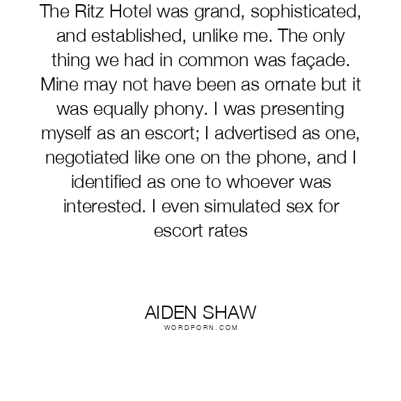 The Ritz Hotel was grand, sophisticated, and established, unlike me. The only thing we had in common was façade. Mine may not have been as ornate but it was equally phony. I was presenting myself as an escort; I advertised as one, negotiated like one on the phone, and I identified as one to whoever was interested. I even simulated sex for escort rates