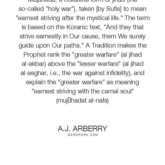 Mujāhada, a collateral form of jihād (the so-called "holy war"), taken [by Sufis] to mean "earnest striving after the mystical life." The term is based on the Koranic text, "And they that strive earnestly in Our cause, them We surely guide upon Our paths." A Tradition makes the Prophet rank the "greater warfare" (al jihad al-akbar) above the "lesser warfare" (al jihad al-asghar, i.e., the war against infidelity), and explain the "greater warfare" as meaning "earnest striving with the carnal soul" (mujāhadat al-nafs)