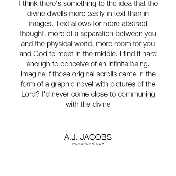 I think there's something to the idea that the divine dwells more easily in text than in images. Text allows for more abstract thought, more of a separation between you and the physical world, more room for you and God to meet in the middle. I find it hard enough to conceive of an infinite being. Imagine if those original scrolls came in the form of a graphic novel with pictures of the Lord? I'd never come close to communing with the divine