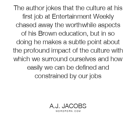 The author jokes that the culture at his first job at Entertainment Weekly chased away the worthwhile aspects of his Brown education, but in so doing he makes a subtle point about the profound impact of the culture with which we surround ourselves and how easily we can be defined and constrained by our jobs