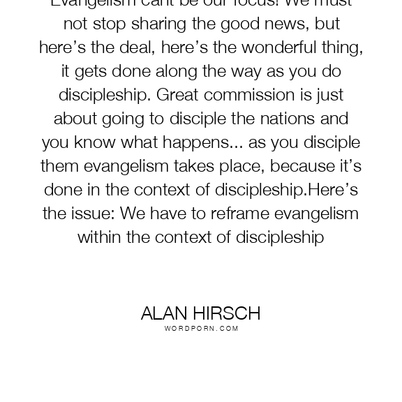 Evangelism cant be our focus! We must not stop sharing the good news, but here’s the deal, here’s the wonderful thing, it gets done along the way as you do discipleship. Great commission is just about going to disciple the nations and you know what happens... as you disciple them evangelism takes place, because it’s done in the context of discipleship.Here’s the issue: We have to reframe evangelism within the context of discipleship