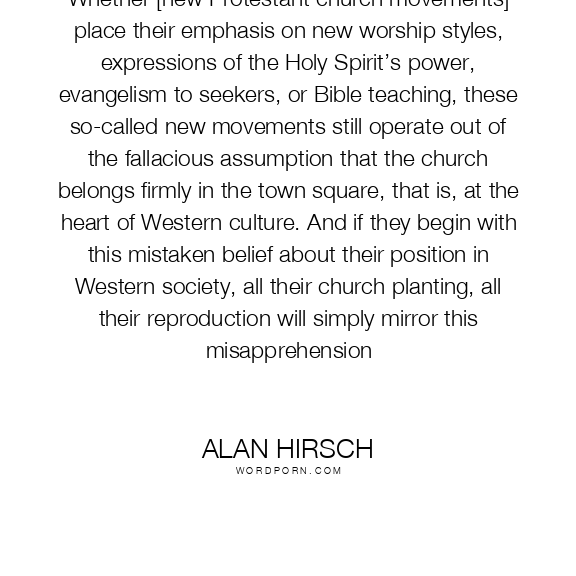 Whether [new Protestant church movements] place their emphasis on new worship styles, expressions of the Holy Spirit’s power, evangelism to seekers, or Bible teaching, these so-called new movements still operate out of the fallacious assumption that the church belongs firmly in the town square, that is, at the heart of Western culture. And if they begin with this mistaken belief about their position in Western society, all their church planting, all their reproduction will simply mirror this misapprehension