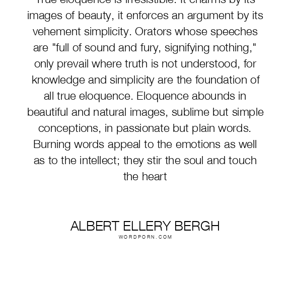 True eloquence is irresistible. It charms by its images of beauty, it enforces an argument by its vehement simplicity. Orators whose speeches are "full of sound and fury, signifying nothing," only prevail where truth is not understood, for knowledge and simplicity are the foundation of all true eloquence. Eloquence abounds in beautiful and natural images, sublime but simple conceptions, in passionate but plain words. Burning words appeal to the emotions as well as to the intellect; they stir the soul and touch the heart