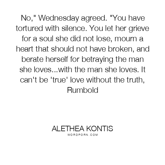 No," Wednesday agreed. "You have tortured with silence. You let her grieve for a soul she did not lose, mourn a heart that should not have broken, and berate herself for betraying the man she loves...with the man she loves. It can't be 'true' love without the truth, Rumbold