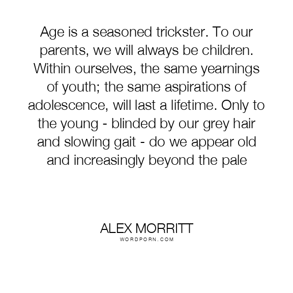 Age is a seasoned trickster. To our parents, we will always be children. Within ourselves, the same yearnings of youth; the same aspirations of adolescence, will last a lifetime. Only to the young - blinded by our grey hair and slowing gait - do we appear old and increasingly beyond the pale
