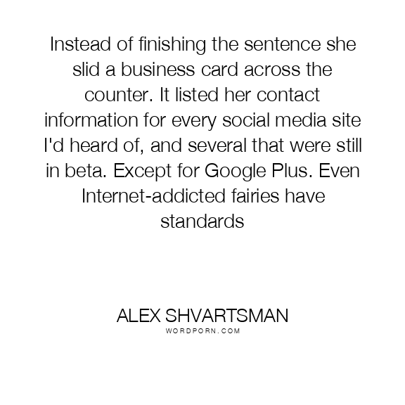 Instead of finishing the sentence she slid a business card across the counter. It listed her contact information for every social media site I'd heard of, and several that were still in beta. Except for Google Plus. Even Internet-addicted fairies have standards