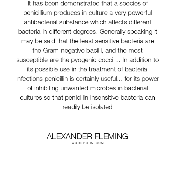 It has been demonstrated that a species of penicillium produces in culture a very powerful antibacterial substance which affects different bacteria in different degrees. Generally speaking it may be said that the least sensitive bacteria are the Gram-negative bacilli, and the most susceptible are the pyogenic cocci ... In addition to its possible use in the treatment of bacterial infections penicillin is certainly useful... for its power of inhibiting unwanted microbes in bacterial cultures so that penicillin insensitive bacteria can readily be isolated