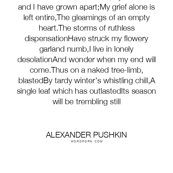 I have outlasted all desire,My dreams and I have grown apart;My grief alone is left entire,The gleamings of an empty heart.The storms of ruthless dispensationHave struck my flowery garland numb,I live in lonely desolationAnd wonder when my end will come.Thus on a naked tree-limb, blastedBy tardy winter's whistling chill,A single leaf which has outlastedIts season will be trembling still