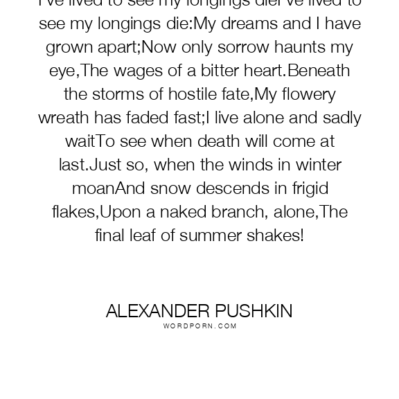 I've lived to see my longings dieI've lived to see my longings die:My dreams and I have grown apart;Now only sorrow haunts my eye,The wages of a bitter heart.Beneath the storms of hostile fate,My flowery wreath has faded fast;I live alone and sadly waitTo see when death will come at last.Just so, when the winds in winter moanAnd snow descends in frigid flakes,Upon a naked branch, alone,The final leaf of summer shakes!