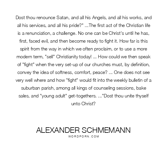 Dost thou renounce Satan, and all his Angels, and all his works, and all his services, and all his pride?" ...The first act of the Christian life is a renunciation, a challenge. No one can be Christ's until he has, first, faced evil, and then become ready to fight it. How far is this spirit from the way in which we often proclaim, or to use a more modern term, "sell" Christianity today! ... How could we then speak of "fight" when the very set-up of our churches must, by definition, convey the idea of softness, comfort, peace? ... One does not see very well where and how "fight" would fit into the weekly bulletin of a suburban parish, among all kings of counseling sessions, bake sales, and "young adult" get-togethers. ..."Dost thou unite thyself unto Christ?