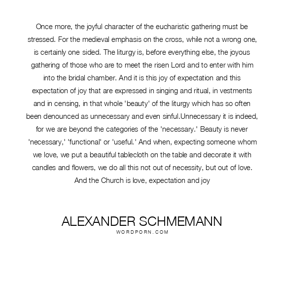 Alexander Schmemann quote. Once more, the joyful character of the eucharistic gathering must be stressed. For the medieval emphasis on the cross, while not a wrong one, is certainly one-sided. The liturgy is, before everything else, the joyous gathering of those who are to meet the risen Lord and to enter with him into the bridal chamber. And it is this joy of expectation and this expectation of joy that are expressed in singing and ritual, in vestments and in censing, in that whole 'beauty' of the liturgy which has so often been denounced as unnecessary and even sinful.Unnecessary it is indeed, for we are beyond the categories of the 'necessary.' Beauty is never 'necessary,' 'functional' or 'useful.' And when, expecting someone whom we love, we put a beautiful tablecloth on the table and decorate it with candles and flowers, we do all this not out of necessity, but out of love. And the Church is love, expectation and joy