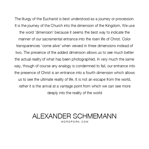 Alexander Schmemann quote. The liturgy of the Eucharist is best understood as a journey or procession. It is the journey of the Church into the dimension of the Kingdom. We use the word 'dimension' because it seems the best way to indicate the manner of our sacramental entrance into the risen life of Christ. Color transparencies 'come alive' when viewed in three dimensions instead of two. The presence of the added dimension allows us to see much better the actual reality of what has been photographed. In very much the same way, though of course any analogy is condemned to fail, our entrance into the presence of Christ is an entrance into a fourth dimension which allows us to see the ultimate reality of life. It is not an escape from the world, rather it is the arrival at a vantage point from which we can see more deeply into the reality of the world