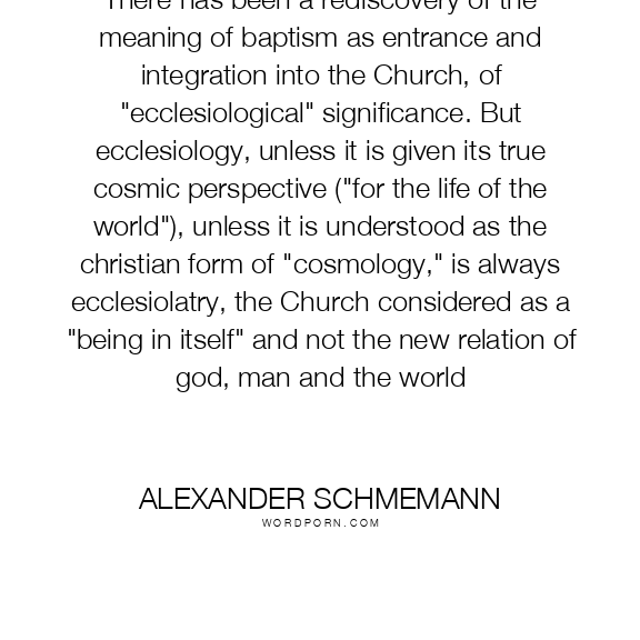 There has been a rediscovery of the meaning of baptism as entrance and integration into the Church, of "ecclesiological" significance. But ecclesiology, unless it is given its true cosmic perspective ("for the life of the world"), unless it is understood as the christian form of "cosmology," is always ecclesiolatry, the Church considered as a "being in itself" and not the new relation of god, man and the world