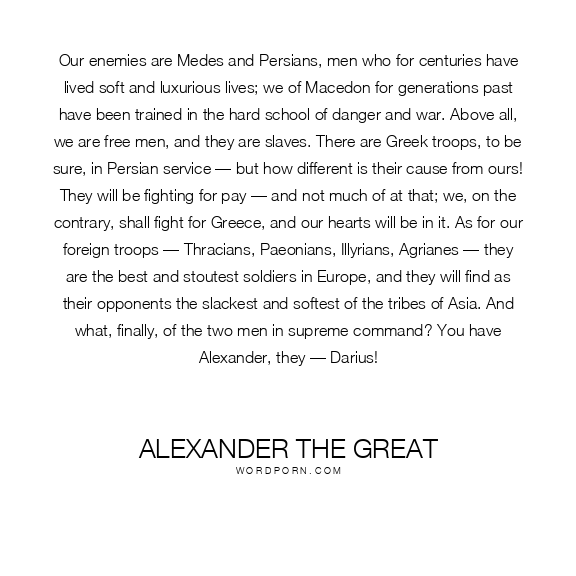Our enemies are Medes and Persians, men who for centuries have lived soft and luxurious lives; we of Macedon for generations past have been trained in the hard school of danger and war. Above all, we are free men, and they are slaves. There are Greek troops, to be sure, in Persian service — but how different is their cause from ours! They will be fighting for pay — and not much of at that; we, on the contrary, shall fight for Greece, and our hearts will be in it. As for our foreign troops — Thracians, Paeonians, Illyrians, Agrianes — they are the best and stoutest soldiers in Europe, and they will find as their opponents the slackest and softest of the tribes of Asia. And what, finally, of the two men in supreme command? You have Alexander, they — Darius!
