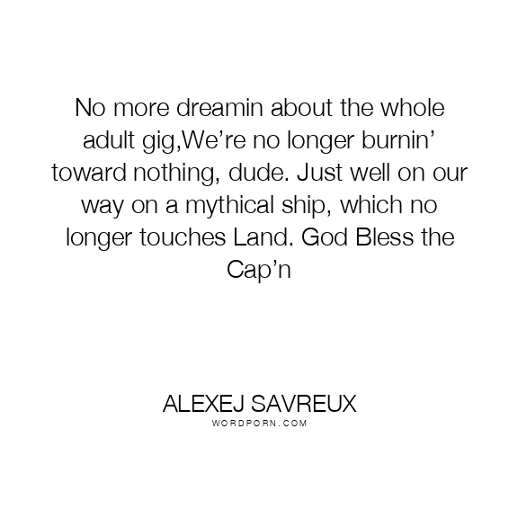 No more dreamin about the whole adult gig,We’re no longer burnin’ toward nothing, dude. Just well on our way on a mythical ship, which no longer touches Land. God Bless the Cap’n