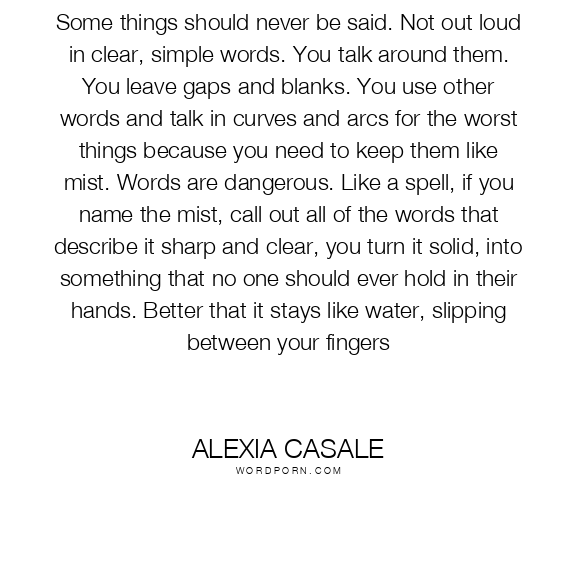 Some things should never be said. Not out loud in clear, simple words. You talk around them. You leave gaps and blanks. You use other words and talk in curves and arcs for the worst things because you need to keep them like mist. Words are dangerous. Like a spell, if you name the mist, call out all of the words that describe it sharp and clear, you turn it solid, into something that no one should ever hold in their hands. Better that it stays like water, slipping between your fingers