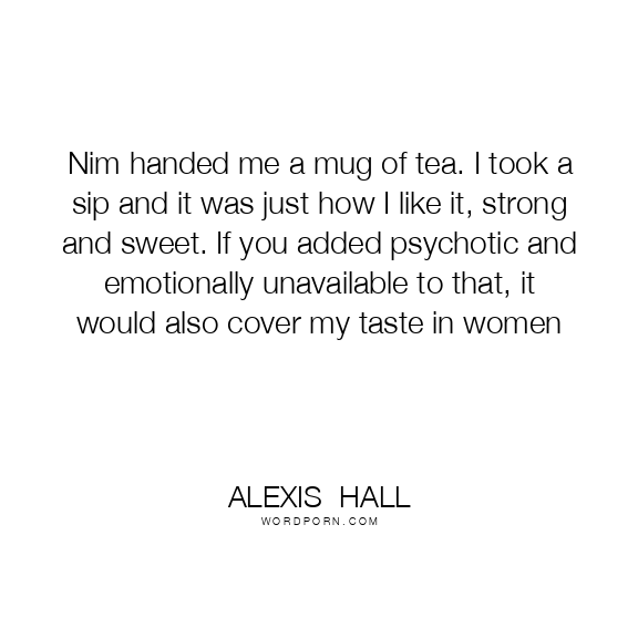 Nim handed me a mug of tea. I took a sip and it was just how I like it, strong and sweet. If you added psychotic and emotionally unavailable to that, it would also cover my taste in women