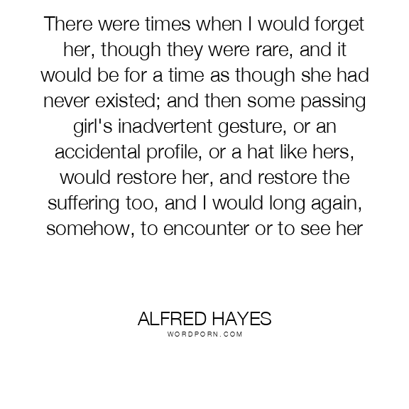 There were times when I would forget her, though they were rare, and it would be for a time as though she had never existed; and then some passing girl's inadvertent gesture, or an accidental profile, or a hat like hers, would restore her, and restore the suffering too, and I would long again, somehow, to encounter or to see her