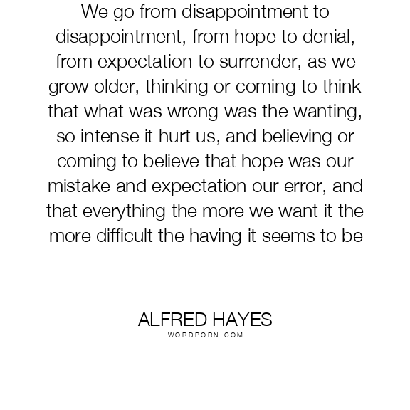 We go from disappointment to disappointment, from hope to denial, from expectation to surrender, as we grow older, thinking or coming to think that what was wrong was the wanting, so intense it hurt us, and believing or coming to believe that hope was our mistake and expectation our error, and that everything the more we want it the more difficult the having it seems to be