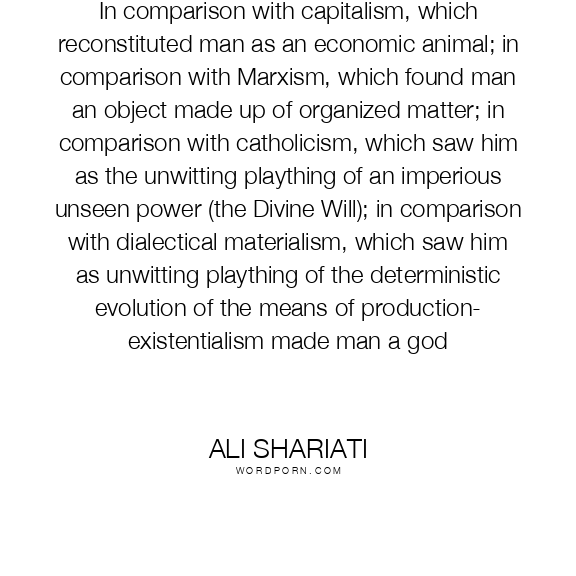 In comparison with capitalism, which reconstituted man as an economic animal; in comparison with Marxism, which found man an object made up of organized matter; in comparison with catholicism, which saw him as the unwitting plaything of an imperious unseen power (the Divine Will); in comparison with dialectical materialism, which saw him as unwitting plaything of the deterministic evolution of the means of production- existentialism made man a god