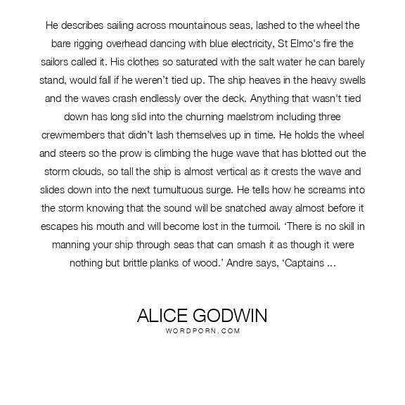 He describes sailing across mountainous seas, lashed to the wheel the bare rigging overhead dancing with blue electricity, St Elmo's fire the sailors called it. His clothes so saturated with the salt water he can barely stand, would fall if he weren’t tied up. The ship heaves in the heavy swells and the waves crash endlessly over the deck. Anything that wasn't tied down has long slid into the churning maelstrom including three crewmembers that didn’t lash themselves up in time. He holds the wheel and steers so the prow is climbing the huge wave that has blotted out the storm clouds, so tall the ship is almost vertical as it crests the wave and slides down into the next tumultuous surge. He tells how he screams into the storm knowing that the sound will be snatched away almost before it escapes his mouth and will become lost in the turmoil. ‘There is no skill in manning your ship through seas that can smash it as though it were nothing but brittle planks of wood.’ Andre says, ‘Captains will boast of their prowess in a storm but you survive purely by the capricious will of the sea. She decides if you live or die, and in that situation all you can do is hold on for the ride and feel privileged that she has allowed you to see her at her most powerful