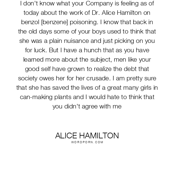 I don't know what your Company is feeling as of today about the work of Dr. Alice Hamilton on benzol [benzene] poisoning. I know that back in the old days some of your boys used to think that she was a plain nuisance and just picking on you for luck. But I have a hunch that as you have learned more about the subject, men like your good self have grown to realize the debt that society owes her for her crusade. I am pretty sure that she has saved the lives of a great many girls in can-making plants and I would hate to think that you didn't agree with me