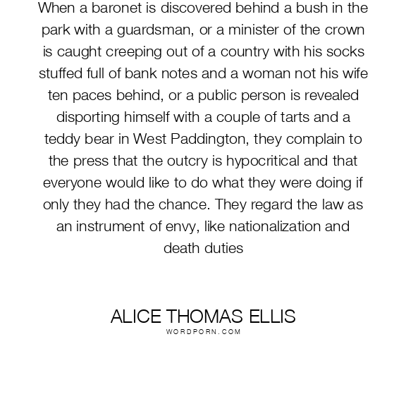 When a baronet is discovered behind a bush in the park with a guardsman, or a minister of the crown is caught creeping out of a country with his socks stuffed full of bank notes and a woman not his wife ten paces behind, or a public person is revealed disporting himself with a couple of tarts and a teddy bear in West Paddington, they complain to the press that the outcry is hypocritical and that everyone would like to do what they were doing if only they had the chance. They regard the law as an instrument of envy, like nationalization and death duties