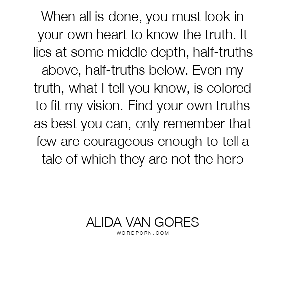 When all is done, you must look in your own heart to know the truth. It lies at some middle depth, half-truths above, half-truths below. Even my truth, what I tell you know, is colored to fit my vision. Find your own truths as best you can, only remember that few are courageous enough to tell a tale of which they are not the hero