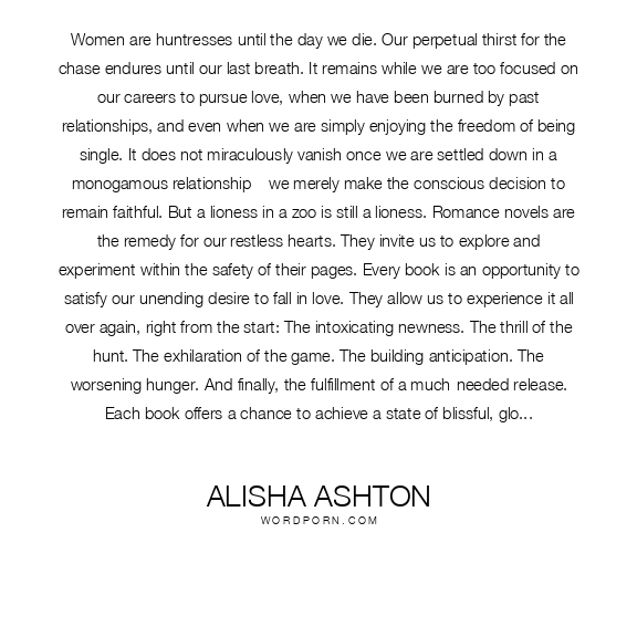 Women are huntresses until the day we die. Our perpetual thirst for the chase endures until our last breath. It remains while we are too focused on our careers to pursue love, when we have been burned by past relationships, and even when we are simply enjoying the freedom of being single. It does not miraculously vanish once we are settled down in a monogamous relationship – we merely make the conscious decision to remain faithful. But a lioness in a zoo is still a lioness. Romance novels are the remedy for our restless hearts. They invite us to explore and experiment within the safety of their pages. Every book is an opportunity to satisfy our unending desire to fall in love. They allow us to experience it all over again, right from the start: The intoxicating newness. The thrill of the hunt. The exhilaration of the game. The building anticipation. The worsening hunger. And finally, the fulfillment of a much-needed release. Each book offers a chance to achieve a state of blissful, glowing contentment… Until the next one catches our eye, that is