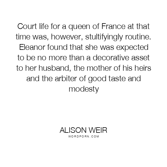 Court life for a queen of France at that time was, however, stultifyingly routine. Eleanor found that she was expected to be no more than a decorative asset to her husband, the mother of his heirs and the arbiter of good taste and modesty