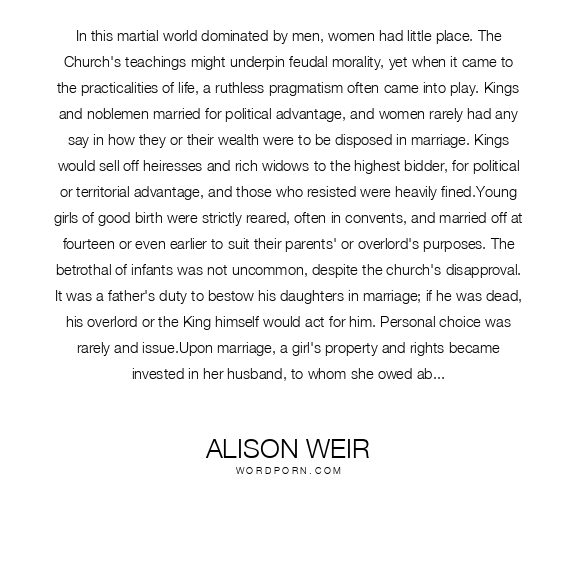In this martial world dominated by men, women had little place. The Church's teachings might underpin feudal morality, yet when it came to the practicalities of life, a ruthless pragmatism often came into play. Kings and noblemen married for political advantage, and women rarely had any say in how they or their wealth were to be disposed in marriage. Kings would sell off heiresses and rich widows to the highest bidder, for political or territorial advantage, and those who resisted were heavily fined.Young girls of good birth were strictly reared, often in convents, and married off at fourteen or even earlier to suit their parents' or overlord's purposes. The betrothal of infants was not uncommon, despite the church's disapproval. It was a father's duty to bestow his daughters in marriage; if he was dead, his overlord or the King himself would act for him. Personal choice was rarely and issue.Upon marriage, a girl's property and rights became invested in her husband, to whom she owed absolute obedience. Every husband had the right to enforce this duty in whichever way he thought fit--as Eleanor was to find out to her cost. Wife-beating was common, although the Church did at this time attempt to restrict the length of the rod that a husband might use