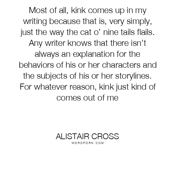 Most of all, kink comes up in my writing because that is, very simply, just the way the cat o’ nine tails flails. Any writer knows that there isn’t always an explanation for the behaviors of his or her characters and the subjects of his or her storylines. For whatever reason, kink just kind of comes out of me