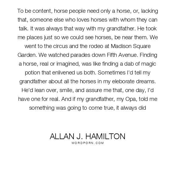 To be content, horse people need only a horse, or, lacking that, someone else who loves horses with whom they can talk. It was always that way with my grandfather. He took me places just so we could see horses, be near them. We went to the circus and the rodeo at Madison Square Garden. We watched parades down Fifth Avenue. Finding a horse, real or imagined, was like finding a dab of magic potion that enlivened us both. Sometimes I'd tell my grandfather about all the horses in my eleborate dreams. He'd lean over, smile, and assure me that, one day, I'd have one for real. And if my grandfather, my Opa, told me something was going to come true, it always did