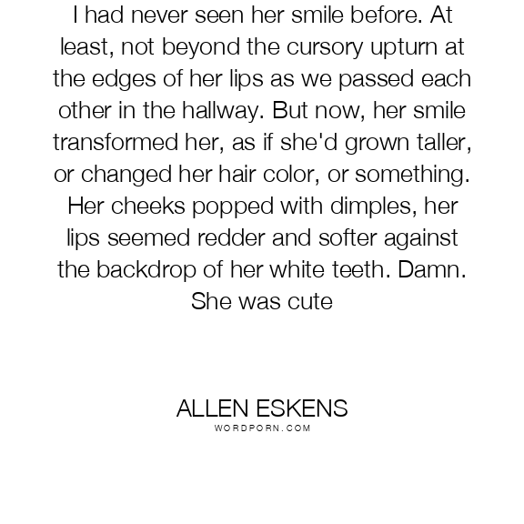 I had never seen her smile before. At least, not beyond the cursory upturn at the edges of her lips as we passed each other in the hallway. But now, her smile transformed her, as if she'd grown taller, or changed her hair color, or something. Her cheeks popped with dimples, her lips seemed redder and softer against the backdrop of her white teeth. Damn. She was cute