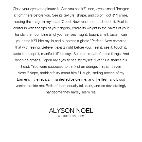Close your eyes and picture it. Can you see it?"I nod, eyes closed."Imagine it right there before you. See its texture, shape, and color—got it?"I smile, holding the image in my head."Good. Now reach out and touch it. Feel its contours with the tips of your fingers, cradle its weight in the palms of your hands, then combine all of your senses—sight, touch, smell, taste—can you taste it?"I bite my lip and suppress a giggle."Perfect. Now combine that with feeling. Believe it exists right before you. Feel it, see it, touch it, taste it, accept it, manifest it!" he says.So I do. I do all of those things. And when he groans, I open my eyes to see for myself."Ever." He shakes his head. "You were supposed to think of an orange. This isn't even close.""Nope, nothing fruity about him." I laugh, smiling ateach of my Damens—the replica I manifested before me, and the flesh and blood version beside me. Both of them equally tall, dark, and so devastatingly handsome they hardly seem real