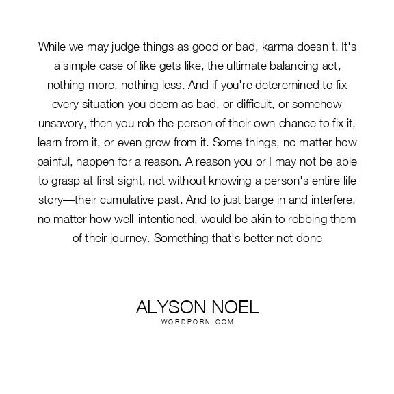 While we may judge things as good or bad, karma doesn't. It's a simple case of like gets like, the ultimate balancing act, nothing more, nothing less. And if you're deteremined to fix every situation you deem as bad, or difficult, or somehow unsavory, then you rob the person of their own chance to fix it, learn from it, or even grow from it. Some things, no matter how painful, happen for a reason. A reason you or I may not be able to grasp at first sight, not without knowing a person's entire life story—their cumulative past. And to just barge in and interfere, no matter how well-intentioned, would be akin to robbing them of their journey. Something that's better not done